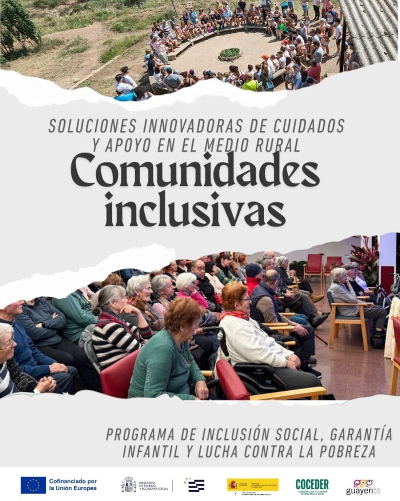 El programa COMUNIDADES INCLUSIVAS: SOLUCIONES INNOVADORAS DE CUIDADO Y APOYO EN EL MEDIO RURAL es una operación de innovación social del Ministerio de Trabajo y Economía Social en el marco del Programa FSE+ de Inclusión social, garantía infantil y lucha contra la pobreza y cofinanciado por la Unión Europea y el Ministerio de Derechos Sociales, Consumo y Agenda 2030, dentro de los programas de interés social, con cargo a la asignación tributaria del 0’7% del IRPF, está promovido por Coceder y el CDR Asociación Guayente.